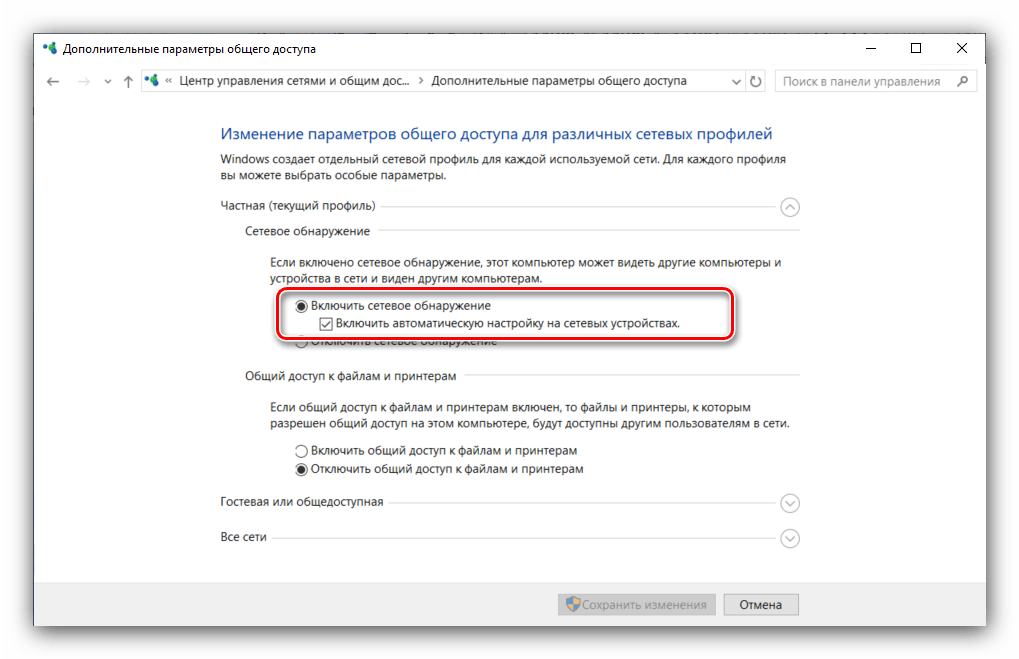 В качестве текущего профиля должен быть отмечен вариант «Частный». Затем раскройте эту категорию и активируйте опции «Включить сетевое обнаружение» и «Включить автоматическую настройку на сетевых устройствах».