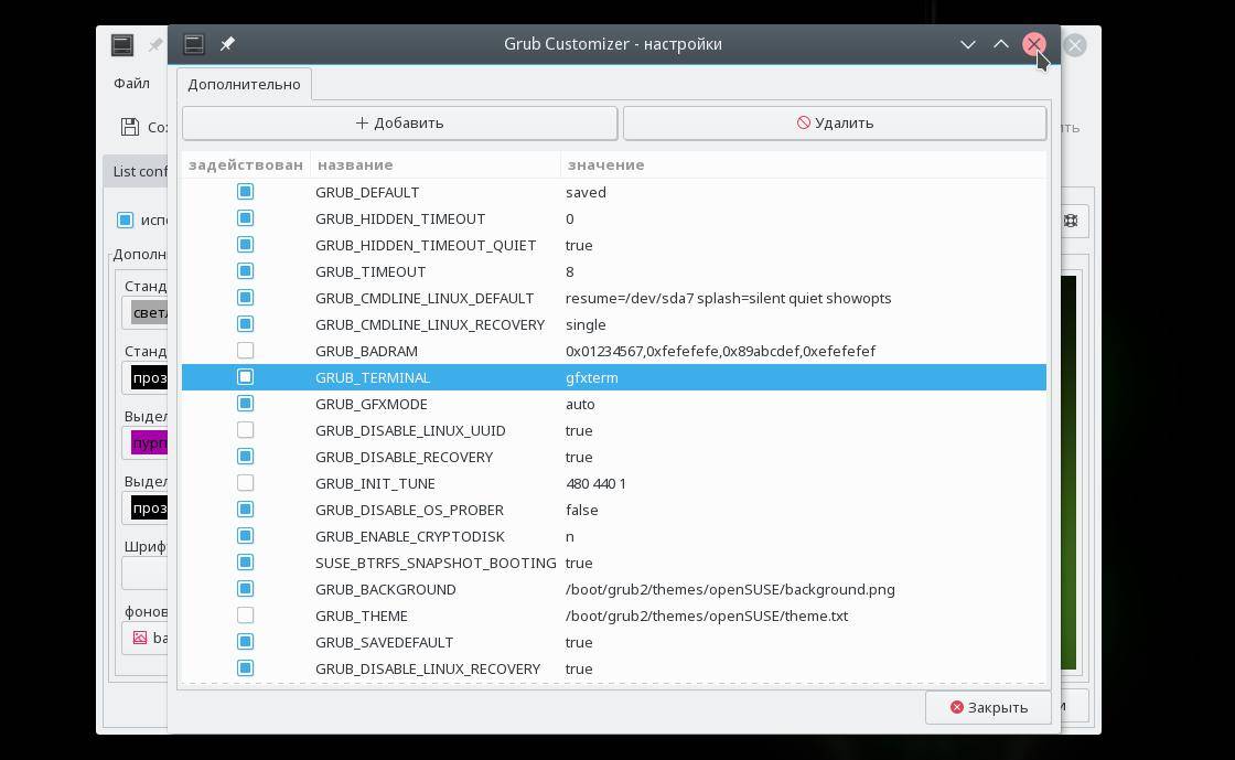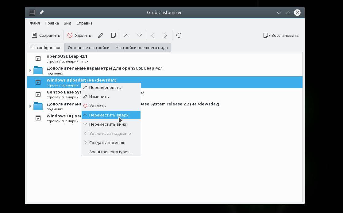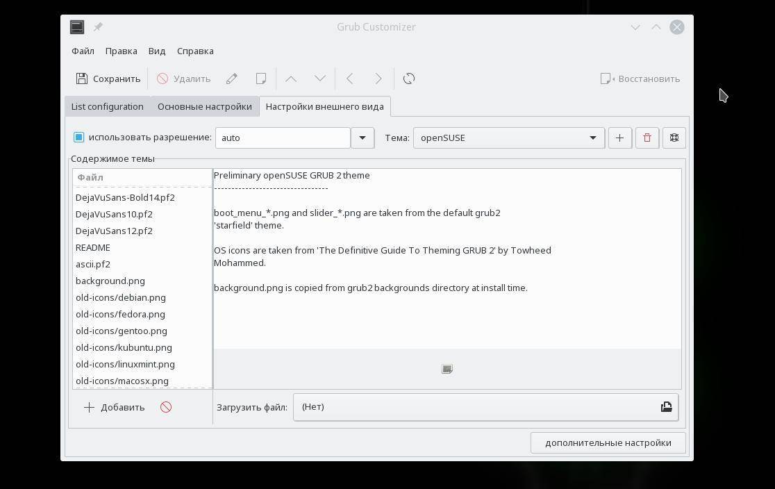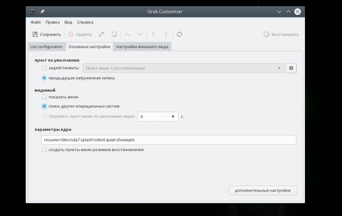 Это самый легкий путь конфигурации загрузчика. Графическая программа настройки Grub Customizer позволяет настроить все основные параметры загрузчика, например, фоновое изображение, шрифт, порядок пунктов загрузки, параметры ядра и многое другое. Все это делается в пару кликов.