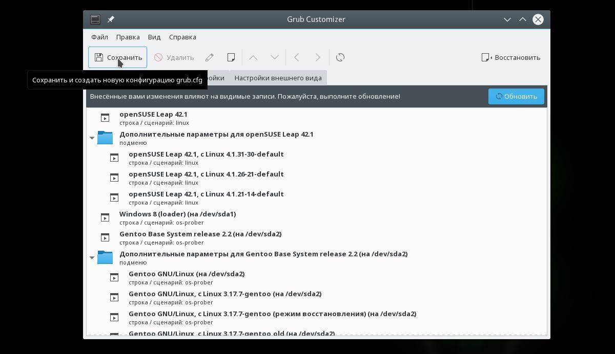 Когда настройка Grub Customizer будет завершена просто нажмите кнопку Сохранить, чтобы применить все изменения.