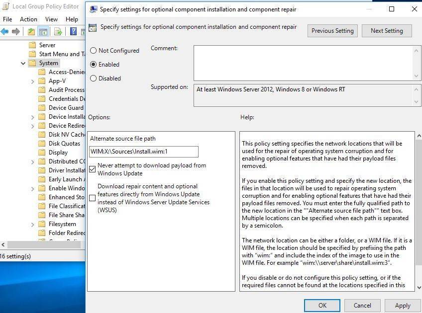 Вы можете настроить свою систему на использование альтернативного источника восстановления, используя параметр групповой политики, запустите gpedit.msc , чтобы открыть редактор групповой политики, и перейдите к следующему параметру: