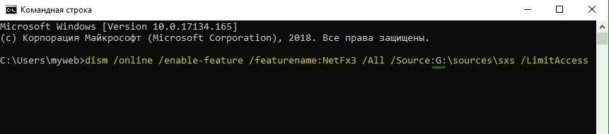 5. В окне командной строки задайте следующую команду dism /online /enable-feature /featurename:NetFx3 /All /Source:G:sourcessxs /LimitAccess и нажмите Enter.