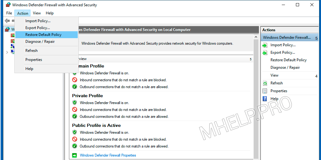 - From the menu, select Action and click Restore Default Policy;
