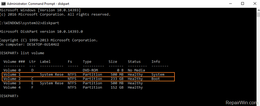 * Note: The System Reserved volume is the volume with the smallest size (commonly 100 or 500MB) and at the Info column has the label «System». If you own an UEFI system, then the System Reserved partition is in Fat32 FS (File System).