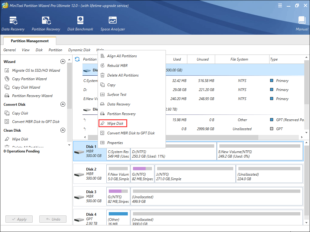 - Right-click on the system disk and choose Wipe Disk from the shortcut menu.
