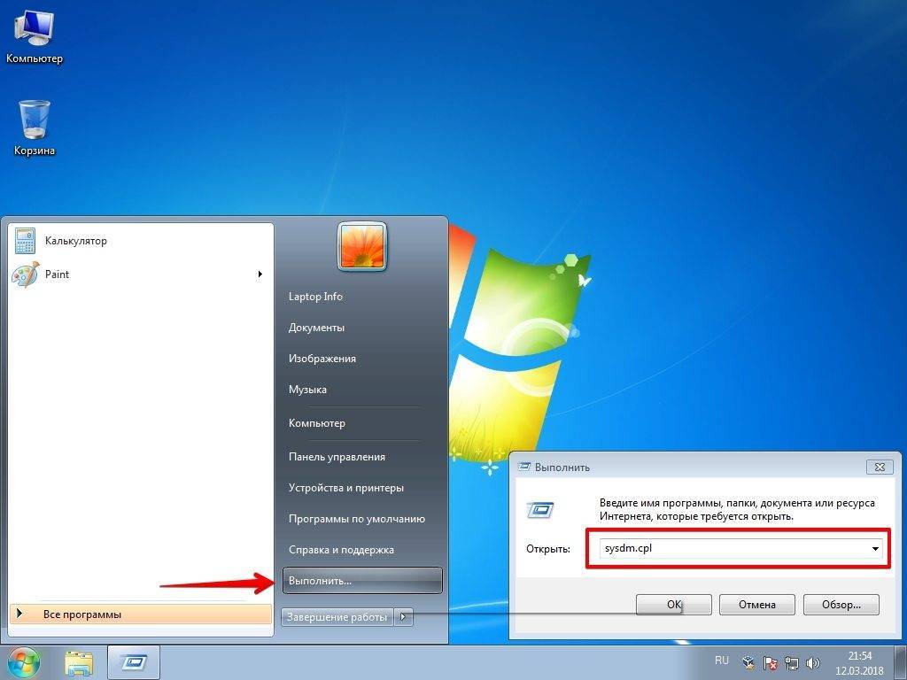 - Нажмите «Пуск», далее «Выполнить» или [Нажмите WIN + R ], в поиске напишите sysdm.cpl и нажмите OK