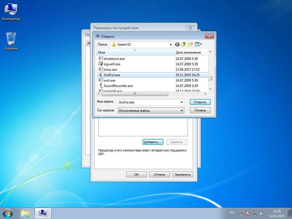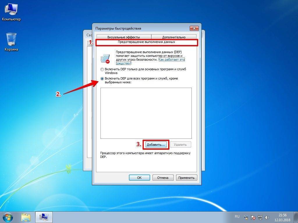 В «Параметры быстродействия» нажмите на «Предотвращение выполнения данных», а затем нажмите на «Включить DEP для всех программ и служб, кроме выбранных ниже» и нажмите «Добавить».