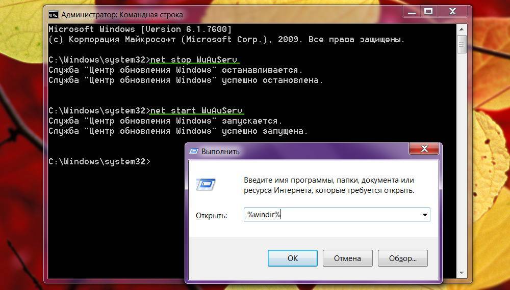 - Не убирая с рабочего стола окно с папкой Windows, вернитесь в Командную строку и выполните net start WuAuServ.