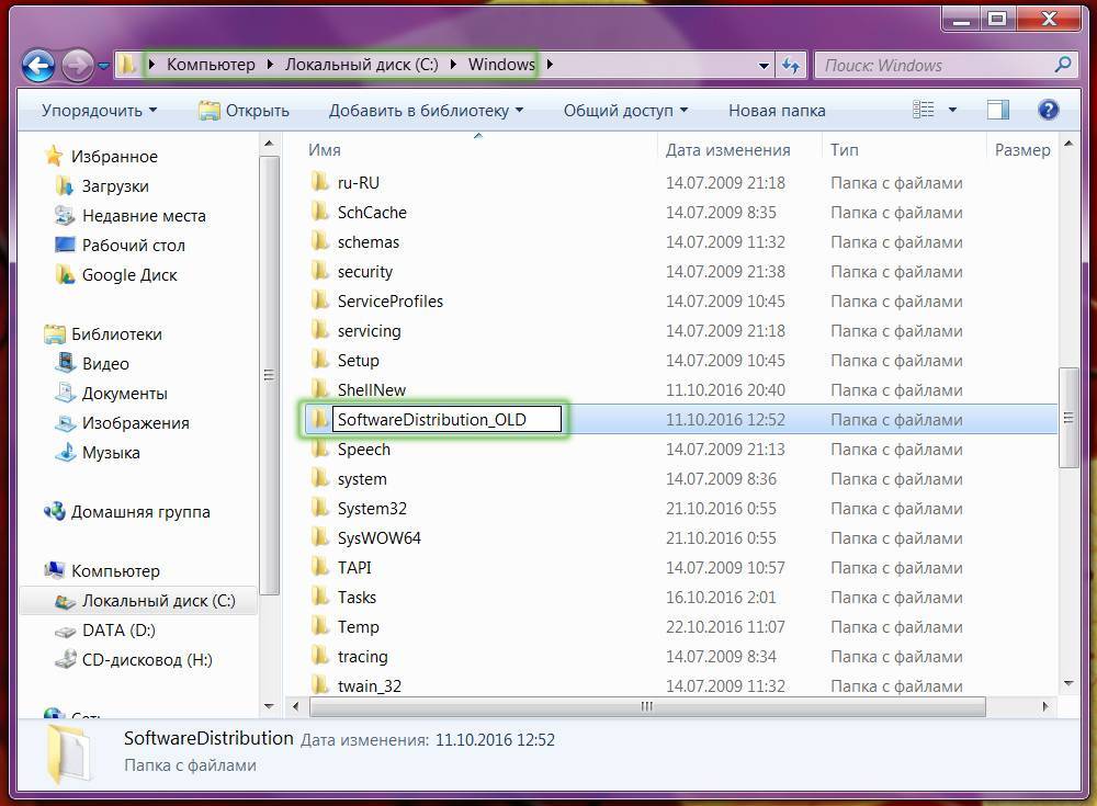 После этого следует зайти в проводник, в нём отыскать папку softwaredistribution, у которой нужно изменить имя, прибавив с правой стороны приставку _OLD.