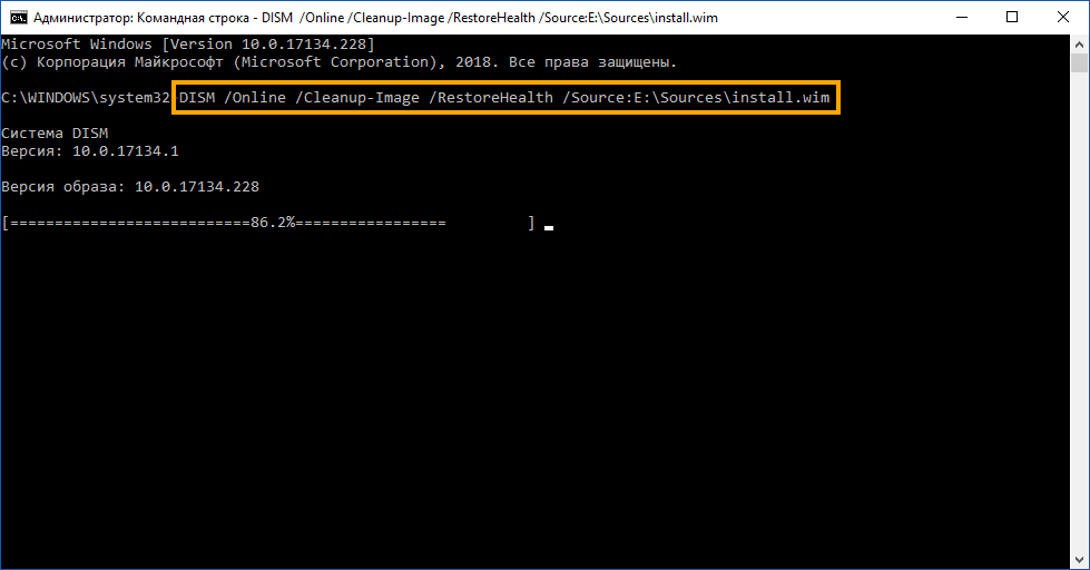- Ввести значение: DISM /Online /Cleanup-Image /RestoreHealth /Source:repairSource\install.wim.