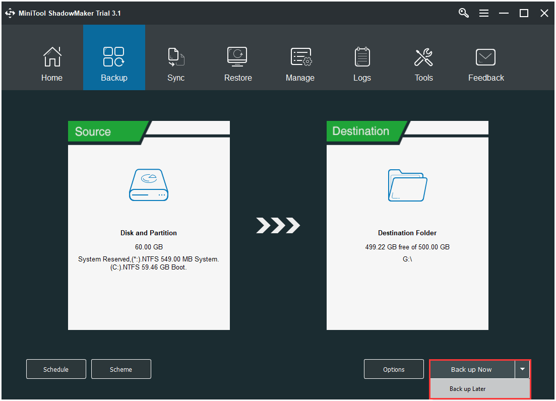 - MiniTool ShadowMaker provides three different backup schemes. Click Scheme to change.