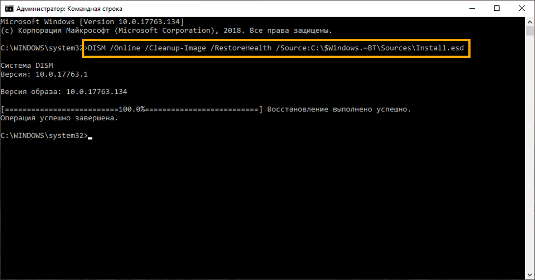 - Ввести: DISM /Online /Cleanup-Image /RestoreHealth /Source:C:\$Windows.~BT\Sources\Install.esd.