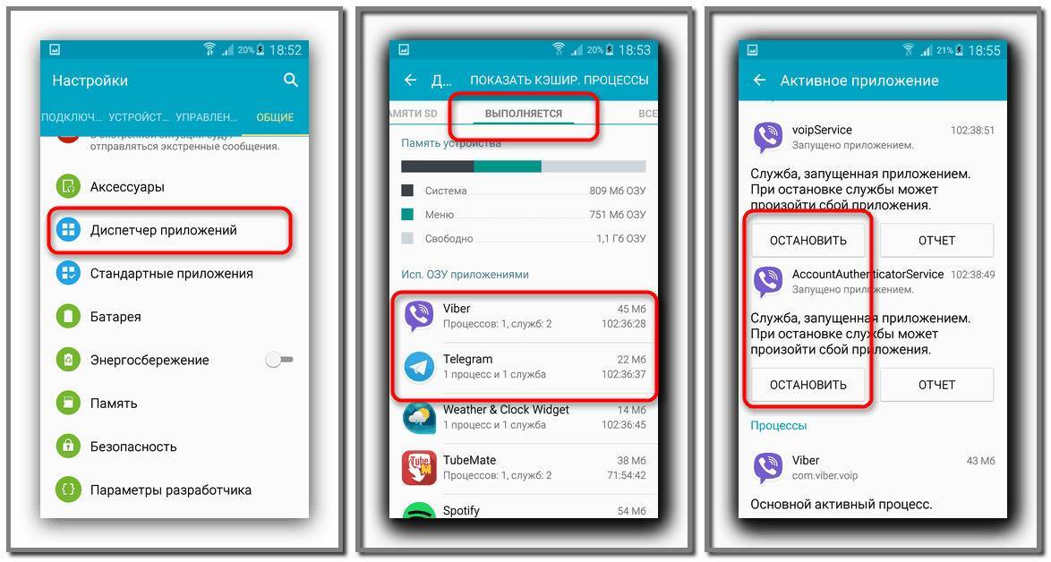 Это список активных в данный момент программ. По очереди выбираем приложения, не являющиеся системными сервисами (типа Viber, WhatsApp, Вконтакте и т.п.) и останавливаем их. Чтобы это сделать, нужно выбрать программу и затем нажать на кнопку Остановить:
