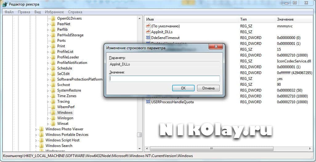 - Перейдите по ветке реестра HKEY_LOCAL_MACHINESOFTWAREMicrosoftWindowsNTCurrentVersionWindows и проверьте значение параметра AppInit_DLLs. Для 64-x битных Windows проверьте также значение параметра AppInit_DLLs по ветке реестра: HKEY_LOCAL_MACHINESOFTWAREMicrosoftWow6432NodeMicrosoftWindowsNTCurrentVersionWindows. В данных параметрах реестра записываются библиотеки (dll файлы) запускаемые при загрузке программ. Если параметр имеет значение, то удалите это значение параметра, но не сам AppInit_DLLs, предварительно запомнив или записав имя файла и путь описанный в значении. В моем случае файл назывался sfdywnj.dll и находился в каталоге C:Windowssystem32.