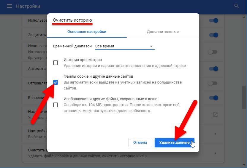 Выберите все 3 пункта: «Удалить историю», «Файлы cookie», «Изображения и другие файлы» и нажмите внизу кнопку «Удалить данные». Очистка браузера Chrome