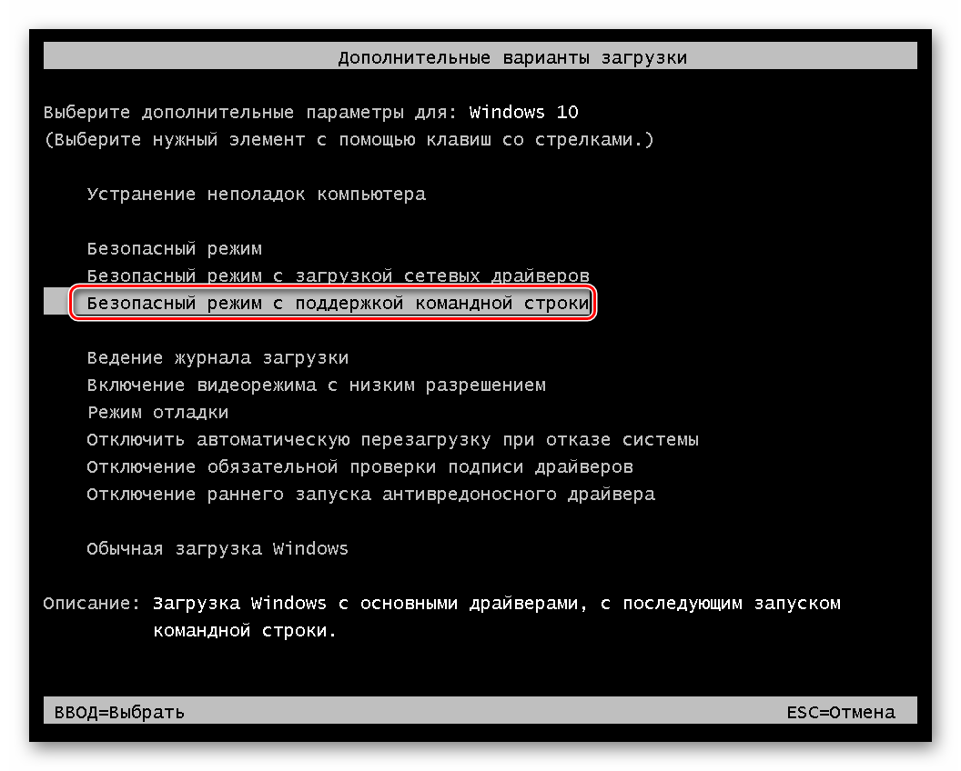 - Отметьте параметр «Безопасный режим с поддержкой командной строки»;