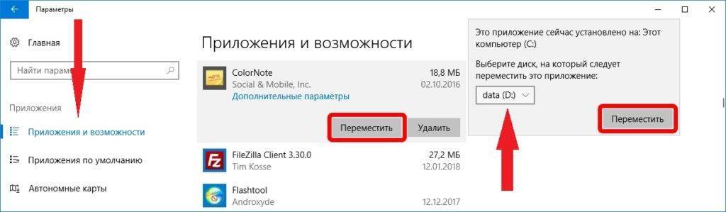 Если же нам нужно переместить установленное приложение , то сделать это можно в разделе Приложения, нажав кнопку Переместить и выбрав нужный локальный диск