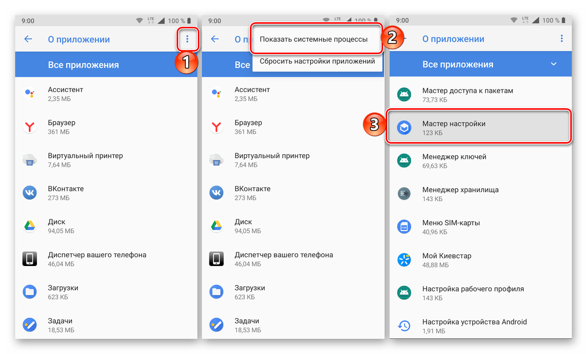 Скорее всего, выполнение вышеописанных действий выкинет вас из «Настроек», а потому повторно запустите их и снова откройте список всех приложений. Вызовите меню (три точки в правом верхнем углу или аналогичный им пункт меню либо отдельная вкладка – зависит от версии Android и типа оболочки) и выберите в нем пункт «Показать системные процессы». Отыщите «Мастер настройки» и таните по его наименованию.