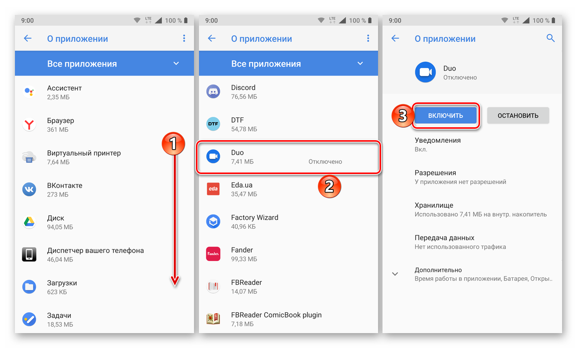 4) вернитесь в «Диспетчер приложений» и найдите отключенные приложения. Включите все отключенные приложения (возможно ошибка возникает из-за того, что приложение связано или ссылается на другое, которое отключено). Для этого поочередно выберите приложения и нажмите “Включить”.