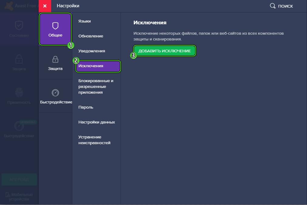 Если игра будет блокироваться антивирусным ПО, то данная ошибка также может проявлять себя. Клиент пытается зайти в сеть и антивирус расценивает это действие как угрозу, блокируя приложение. В результате на экране появляется ошибка, так как игра не смогла подключиться к серверу. Чтобы этого не происходило, необходимо добавить ее в исключения системы безопасности. В зависимости от антивирусного ПО действия могут отличаться, но в большинстве случаев все выглядит так: