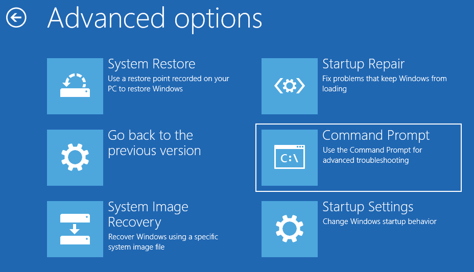 Если ваш компьютер с Windows 10 не загружается, но если вы знаете, как создать USB-накопитель для восстановления Windows 10 или диск, затем вы можете использовать USB-накопитель или диск для восстановления, чтобы загрузить компьютер с Windows 10 в Среда восстановления Windows (Windows RE). Затем вы можете нажать Устранение неполадок -> Дополнительные параметры, нажать Командная строка на синем экране дополнительных параметров и использовать его для запуска chkdsk / f / r команда.