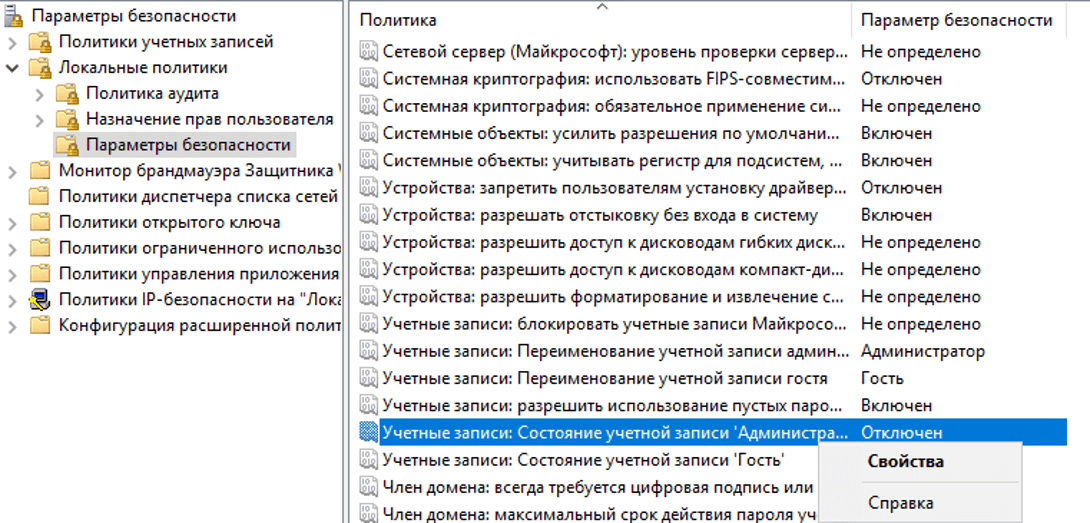 - Выбрать «Учетные записи: состояние учетной записи Администратор».