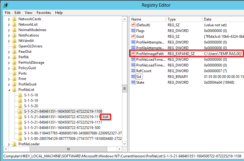 - Вы нашли две ветки, указывающих на ваш профиль: с окончанием .bak и без. В этом случае переименуйте ветку без .bak, добавив в конце небольшой суффикс, например, S-1-5-21-xxxxx.backup. А у профиля с окончанием .bak удалите .bak в имени ветки реестра.