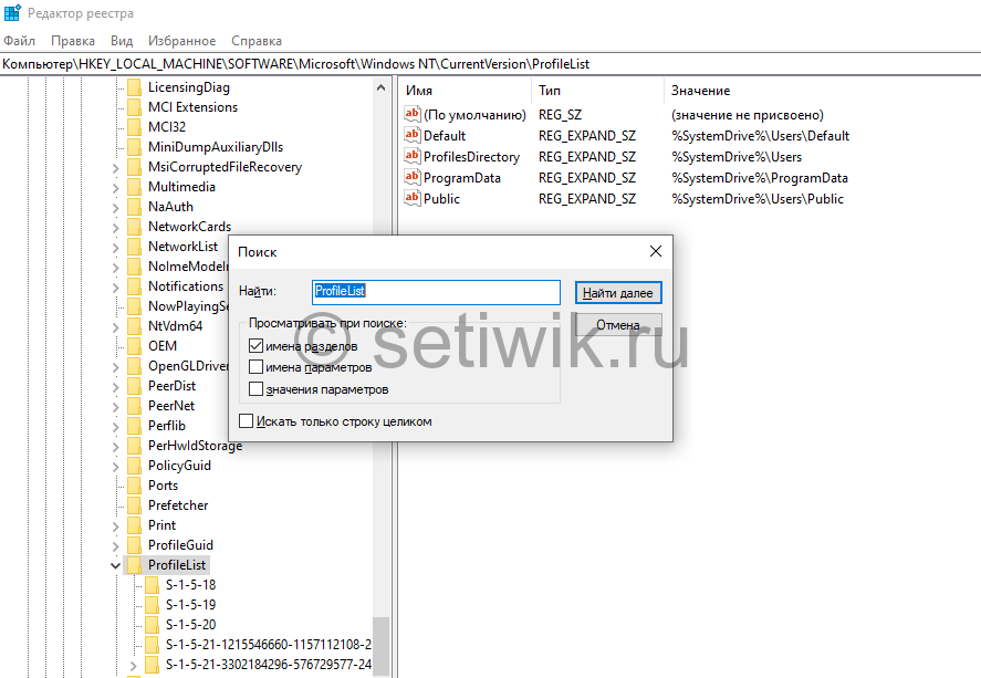Открыв РЕЕСТР мы увидим очень большое множество веток и записей. Чтоб не тратить время надо воспользоваться поиском. Нажимаем CTRL + F, далее копируем «ProfileList» и вставляем в строку поиска как указанно на картинке. Уберите галочки с «Имена Параметров» и «Значение Параметров