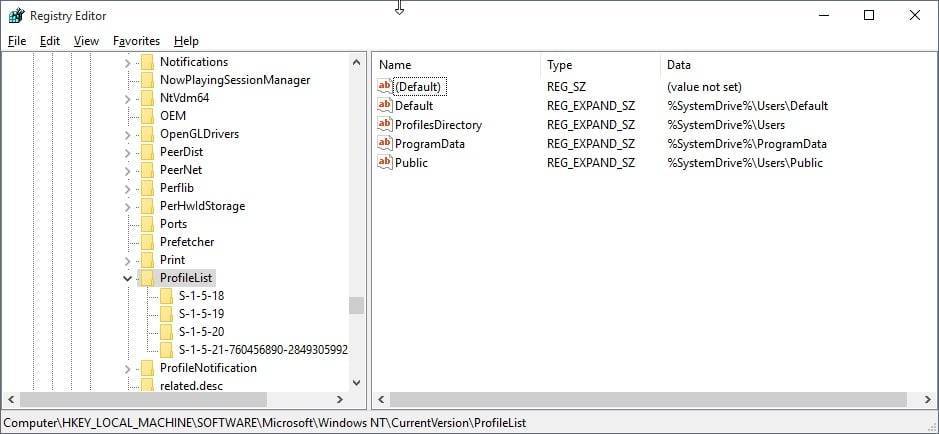 HKEY_LOCAL_MACHINE\SOFTWARE\Microsoft\Windows NT\CurrentVersion\ProfileList