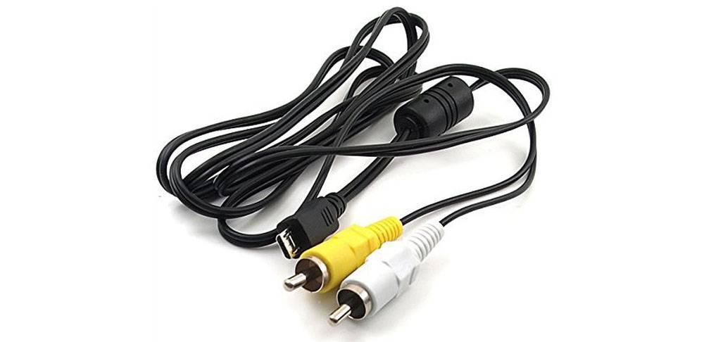 - Проверьте, поставлялся ли в комплекте с фотоаппаратом кабель «AV-micro-sub» или аналогичный кабель, с одной стороны которого находятся так называемые «тюльпаны», а с другой стороны разъём для подключения самой камеры. Если в комплекте его нет (к примеру, девайс покупался «с рук», то есть б/у), потребуется приобрести подобный провод в любом ближайшем компьютерном магазине;