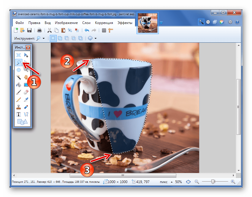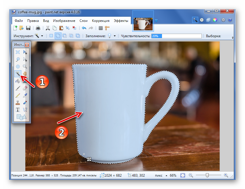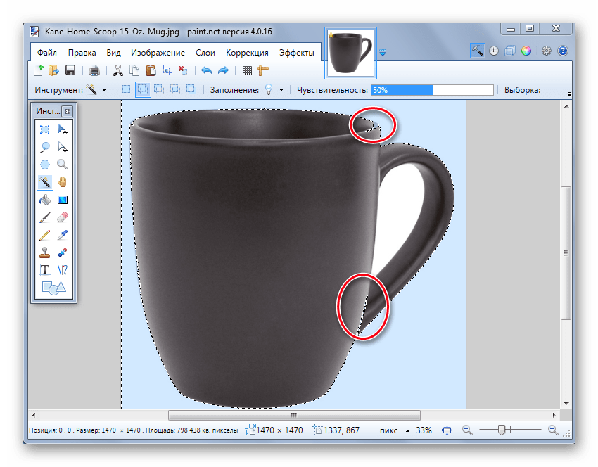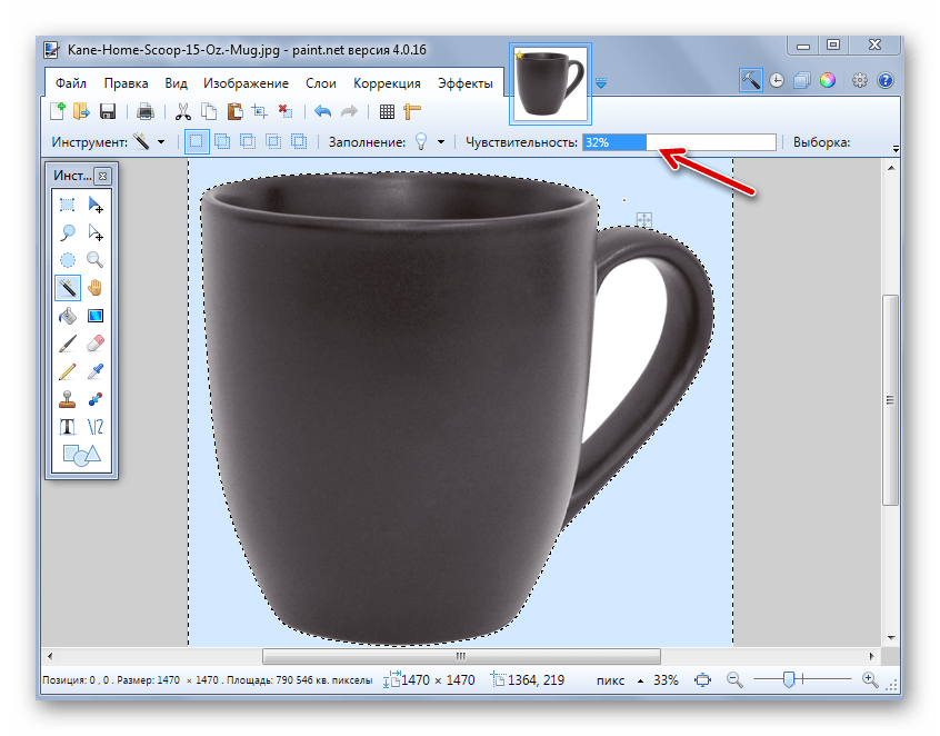 Как видно, сейчас трафарет проходит ровно по краям кружки. Ежели же «Волшебная палочка» напротив оставила куски фона вокруг основного объекта, то чувствительность можно попробовать повысить.