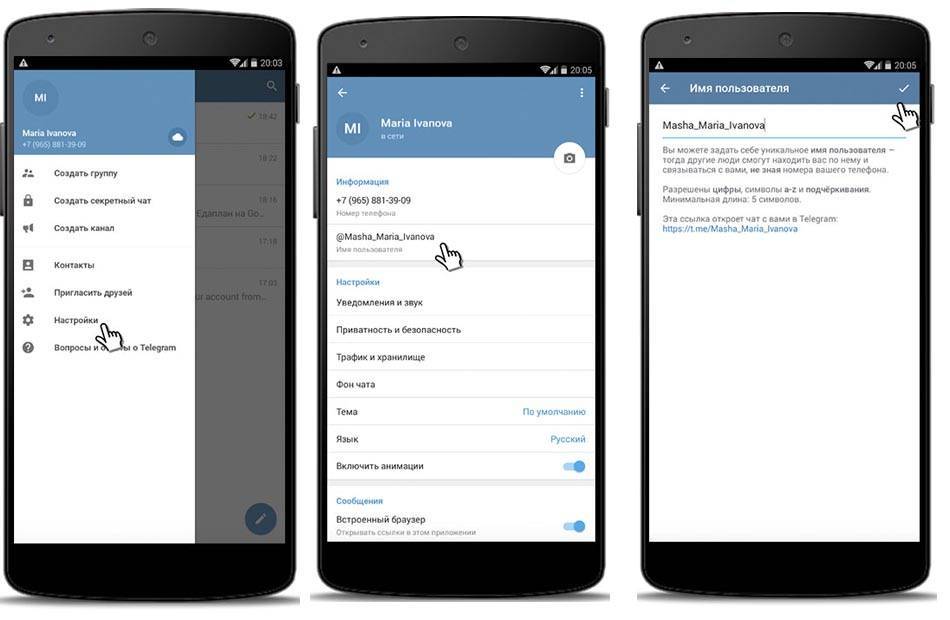 Telegram позволяет изменять имя и фамилию неограниченное количество раз. Помимо этих двух параметров личной информационной странички, пользователям доступна возможность установки уникального имени, которое имеет ряд преимуществ.