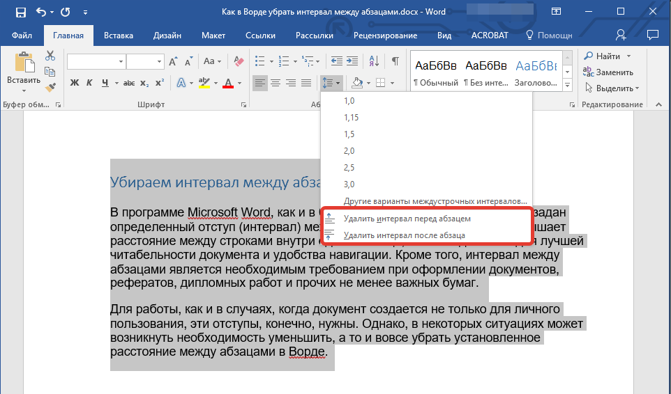 3. Выберите один из двух представленных вариантов в нижней части развернувшегося меню “Добавить интервал перед абзацем” либо же “Добавить интервал после абзаца”. Также можно выбрать оба варианта, установив оба отступа.