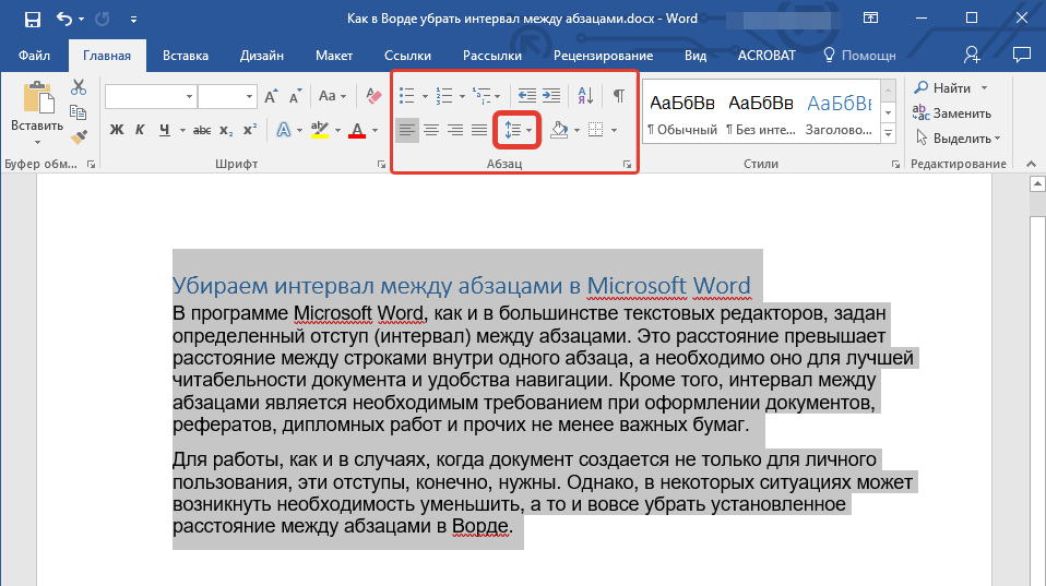 В Ворде по умолчанию установлен определенный междустрочный интервал, размер которого в разных версиях программы может отличаться. Так, к примеру, в Microsoft Word 2003 это значение составляет составляет 1,0, а в более новых версиях уже 1,15. Сам же значок интервала можно найти во вкладке “Главная” в группе “Абзац” — там просто указаны числовые данные, но галочка не установлена ни возле одного из них. О том, как увеличить или уменьшить в Ворде расстояние между строками и пойдет речь ниже.