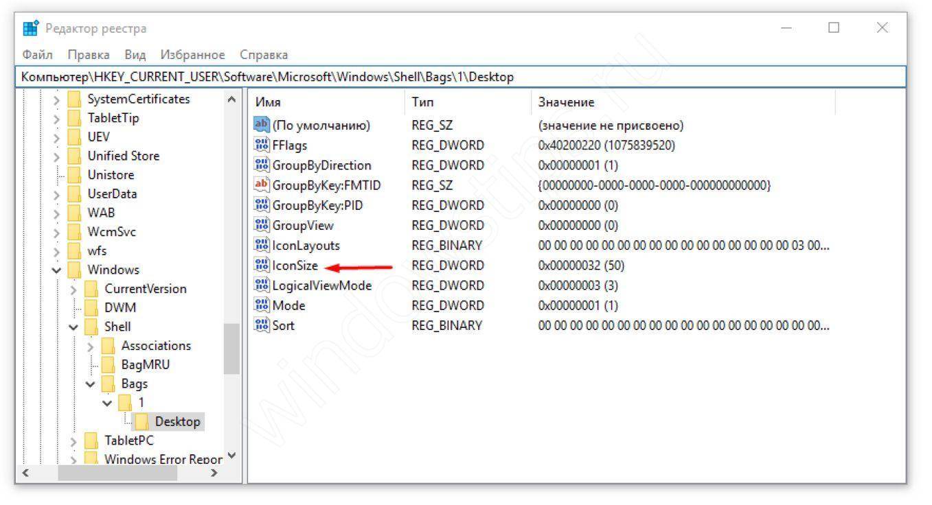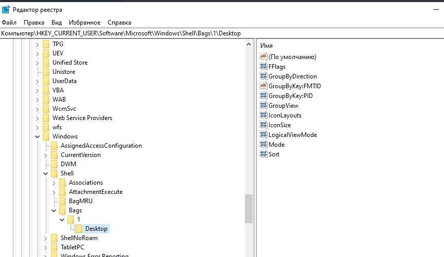 откроется окно редактора, в правой части которого необходимо пройти по некоторым папкам: «Компьютер, Hkey_Current_User, Software, Microsoft, Windows, Shell, Bags, 1, Desktop»;