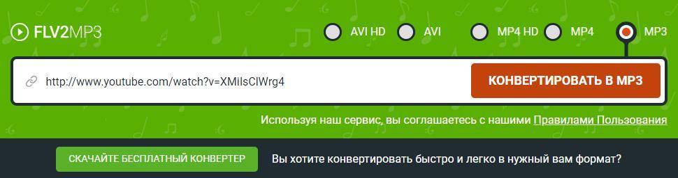 flvto – это сайт с русскоязычным интерфейсом, к тому же он позволяет скачивать звук в разных форматах. Качество звука на выходе ограничено 128 кБит/сек. Принцип работы прост – вставить ссылку на видео и нажать на кнопку «Конвертировать в mp3»;