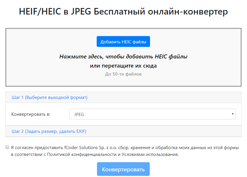 Очень простой конвертер с единственной функцией для преобразования формата HEIC в JPEG, он не поддерживает другие форматы, но дает возможность конвертировать до 50 фотографий одновременно простым и эффективным способом, который может сэкономить много времени и без необходимости загружать что-либо.
