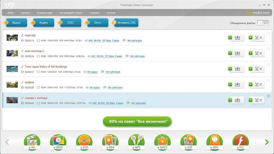 Freemake – это полностью бесплатный видеоконвертер с простым минималистичным интерфейсом. Программа поддерживается на русском языке и обладает простым управлением, поэтому пользоваться ею можно даже совершенно без технических навыков. Пакетная обработка и предустановленные настройки качества изображения значительно увеличивают скорость работы.