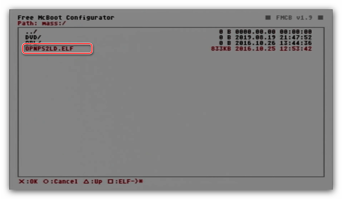 Выберите OPMPS2LD.ELF и снова воспользуйтесь кнопкой Крест.