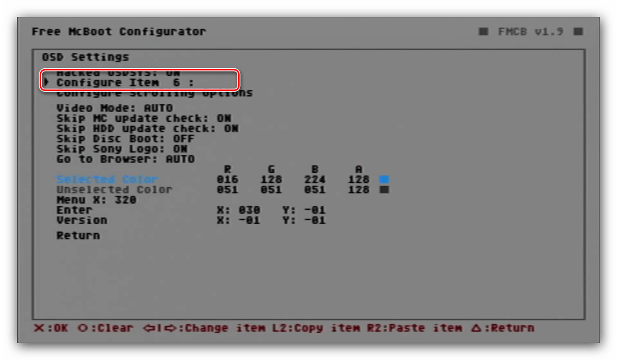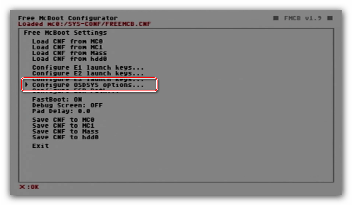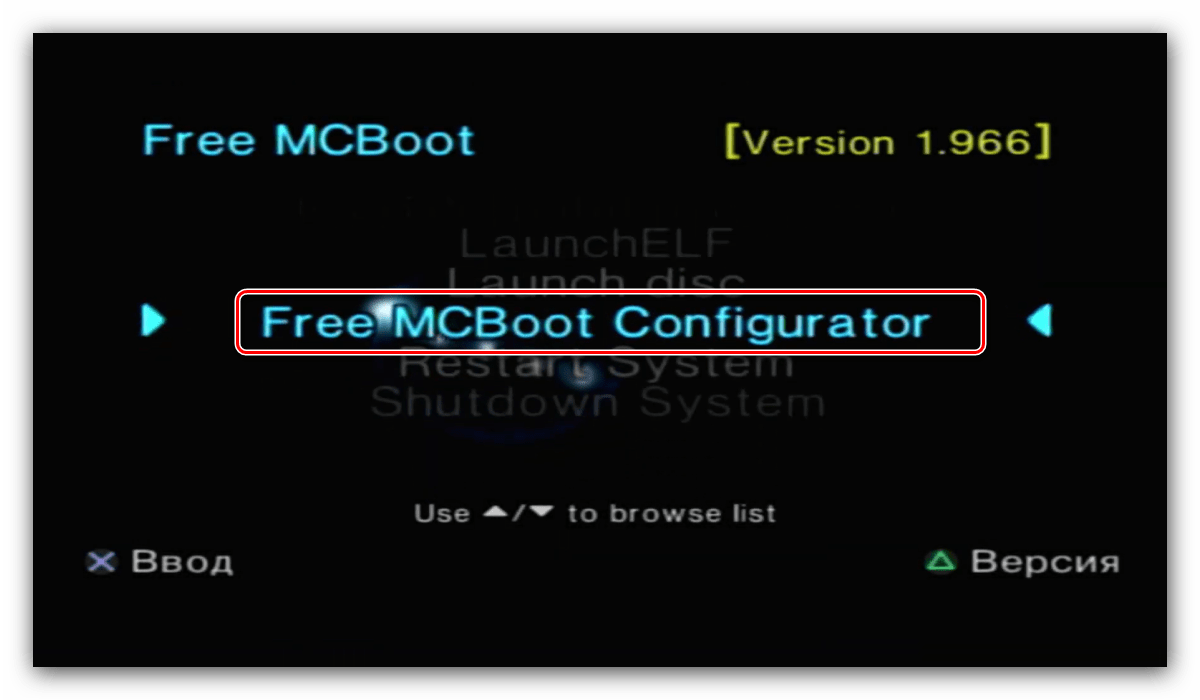 - Включите вашу PlayStation 2, подождите, пока загрузится FMCB, выберите в его главном меню пункт «Free MCBoot Configurator» и нажмите на кнопку Крест на геймпаде.