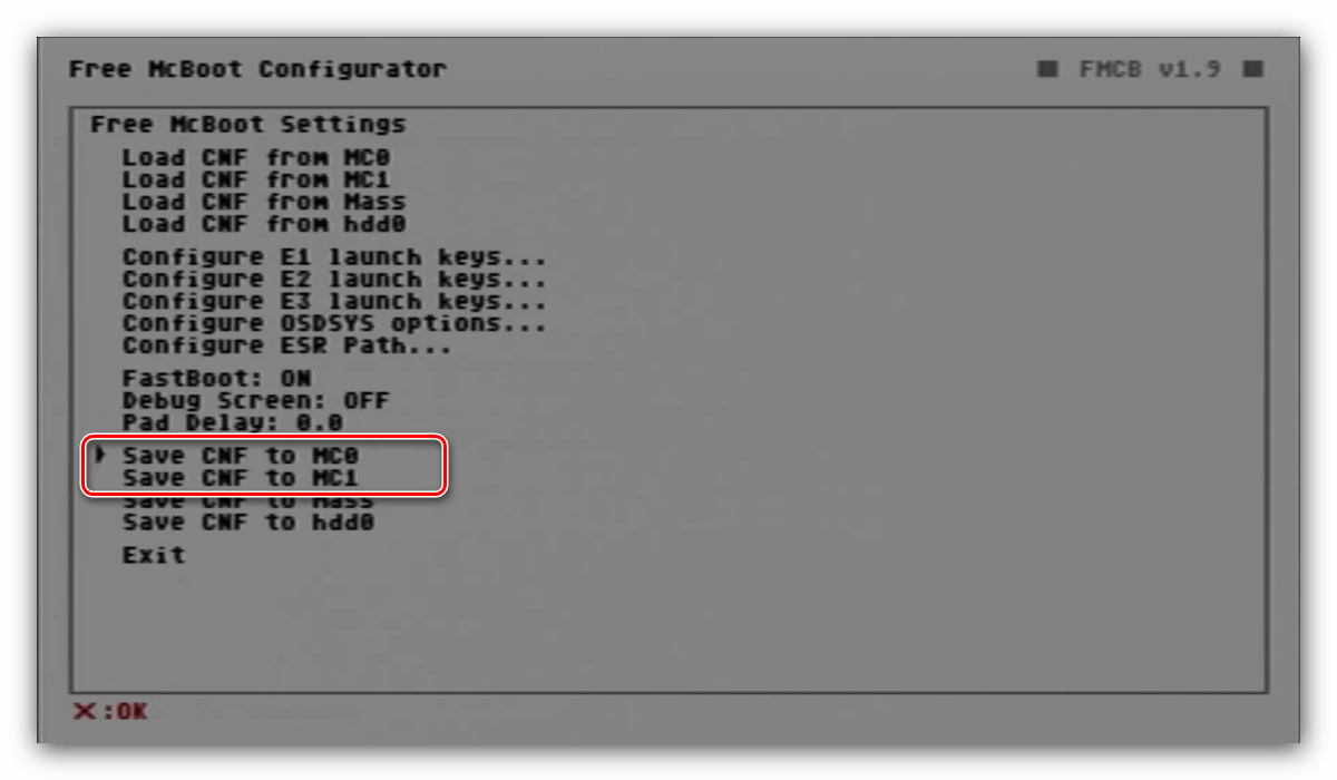 С помощью пунктов «Return» вернитесь в меню из шага 3, и на этот раз таким же образом выберите позиции «Save CNF to MC0» или «Save CNF to MC1», которые отвечают за левый и правый слоты карт памяти приставки.