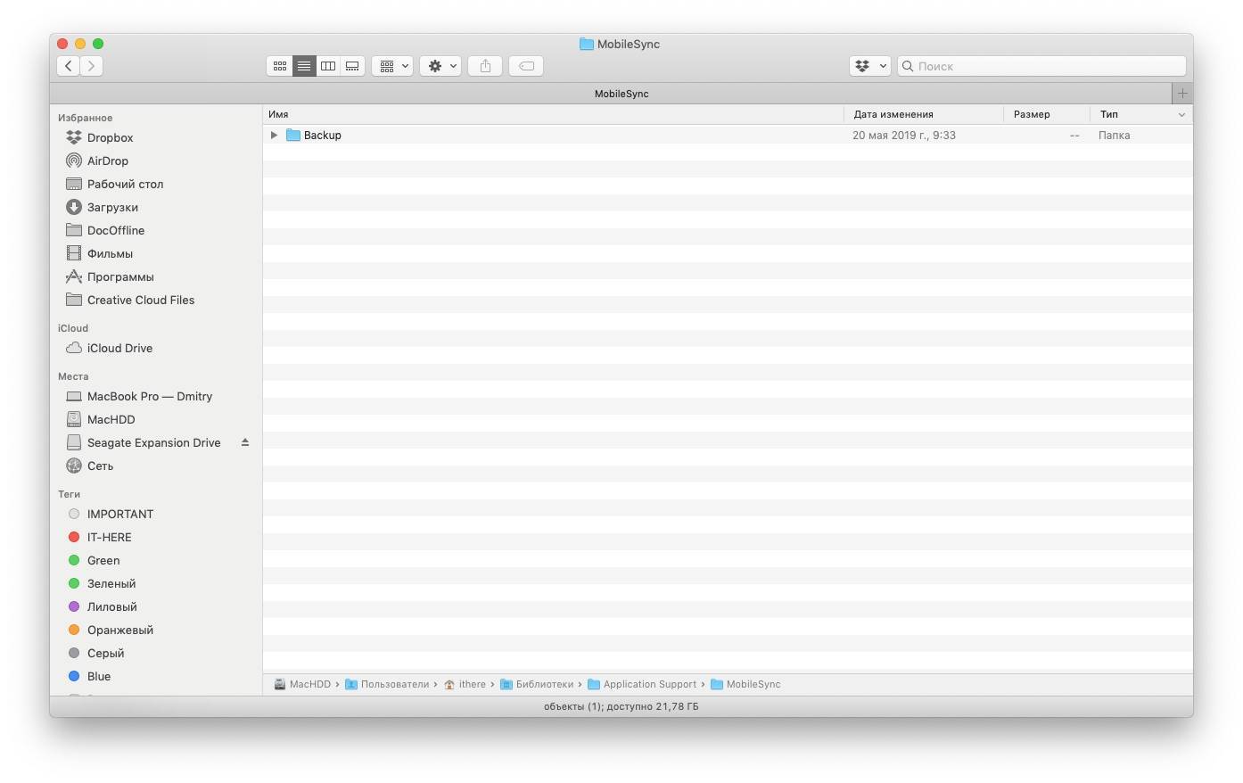 - Открыть место хранения резервной копии iTunes на компьютере (C:\Users\Здесь ваше имя пользователя\AppData\Roaming\Apple Computer\MobileSync) и найти там папку Backup.