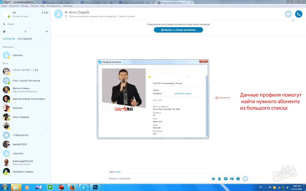 Некоторые нюансы в обращении с программой помогут вам находить нужных людей быстрее, эффективнее работать со Скайпом. Как уже было сказано выше – программа может выдать множество результатов по вашему запросу, с одинаковыми именами и местом проживания. Если вы не можете определиться, кто из них – искомый абонент, просто щелкните правой кнопкой по наиболее подходящему никнейму и выберите в меню пункт “Личные данные”.