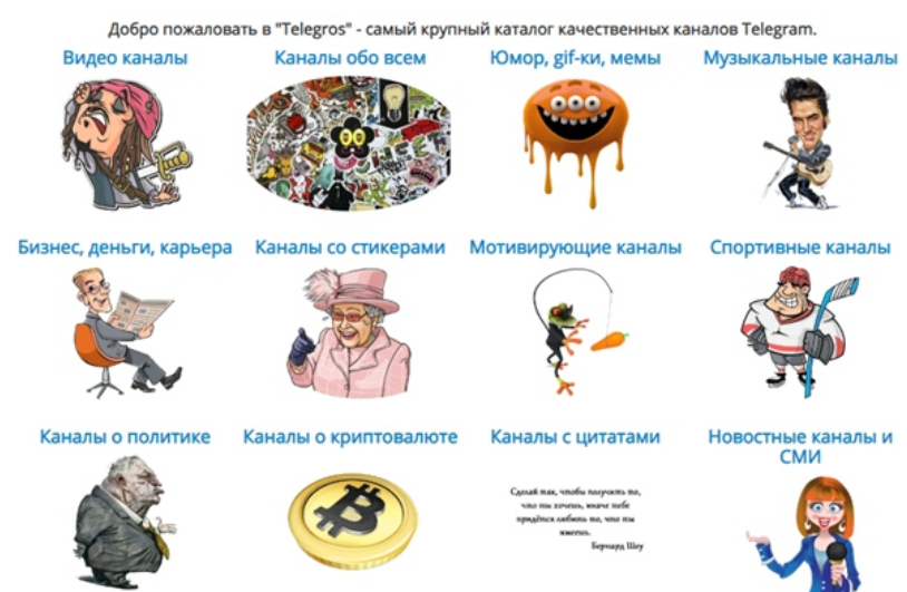- Telegros. Когда я создавала список из 20 каналов, этот сайт мне очень помог. Здесь очень подробное определение категорий, и это значительно упростит вашу задачу.