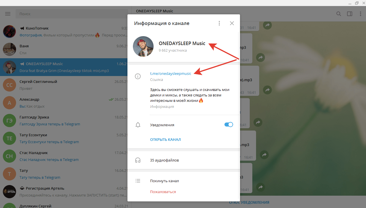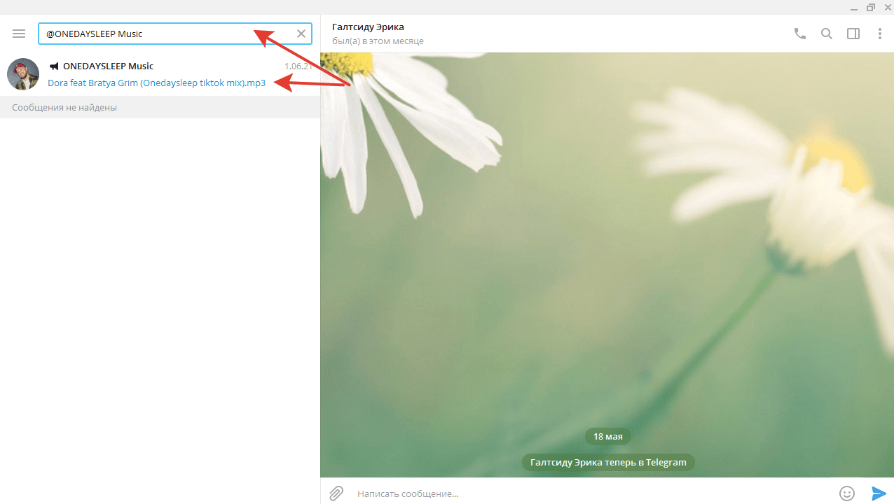 Также поиск осуществляется и по линку сообщества (ссылка). Выглядит это следующим образом: t.me/onedaysleepmusic.