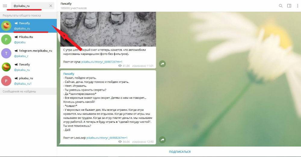 Если пользователь не знает точного наименования паблика, то вводит в строку поиска слова, связанные с тематикой сообщества. В результате одновременно отобразятся чаты и каналы. Юзеру остается выбрать искомый объект.