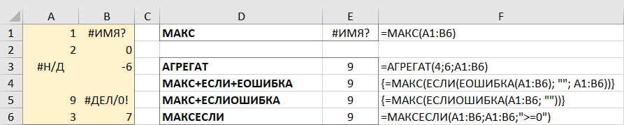Число 4 в первом аргументе предписывает выполнить поиск максимального числа, шестёрка во втором аргументе – это параметр «игнорировать ошибки», а A1: B6 – ваш целевой диапазон.