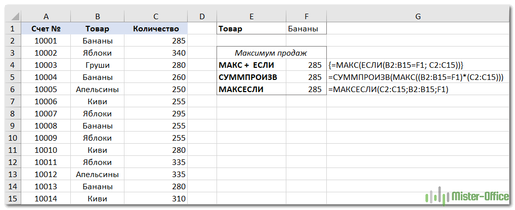 Если вы хотите получить максимальное значение с учётом каких-то условий, вы можете выбрать из нескольких предложенных ниже формул. Чтобы убедиться, что все они возвращают одинаковый результат, мы протестируем их на одном и том же наборе данных.