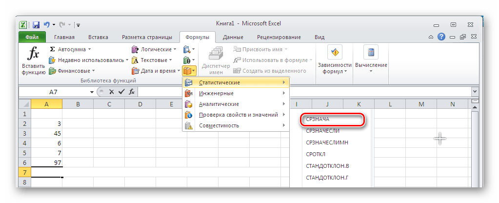 Третий способ вызова функции СРЗНАЧ из панели: «Формула»-«Формула»-«Другие функции»-«Статические»-«СРЗНАЧ».