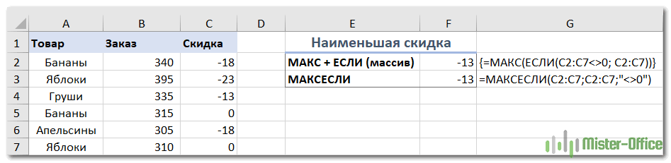 Фактически, это разновидность условного МАКС, рассмотренного в предыдущем примере. Чтобы исключить нули, используйте логический оператор «не равно» и поместите выражение «<> 0» либо в критерий функции МАКСЕСЛИ, либо в конструкцию МАКС + ЕСЛИ.