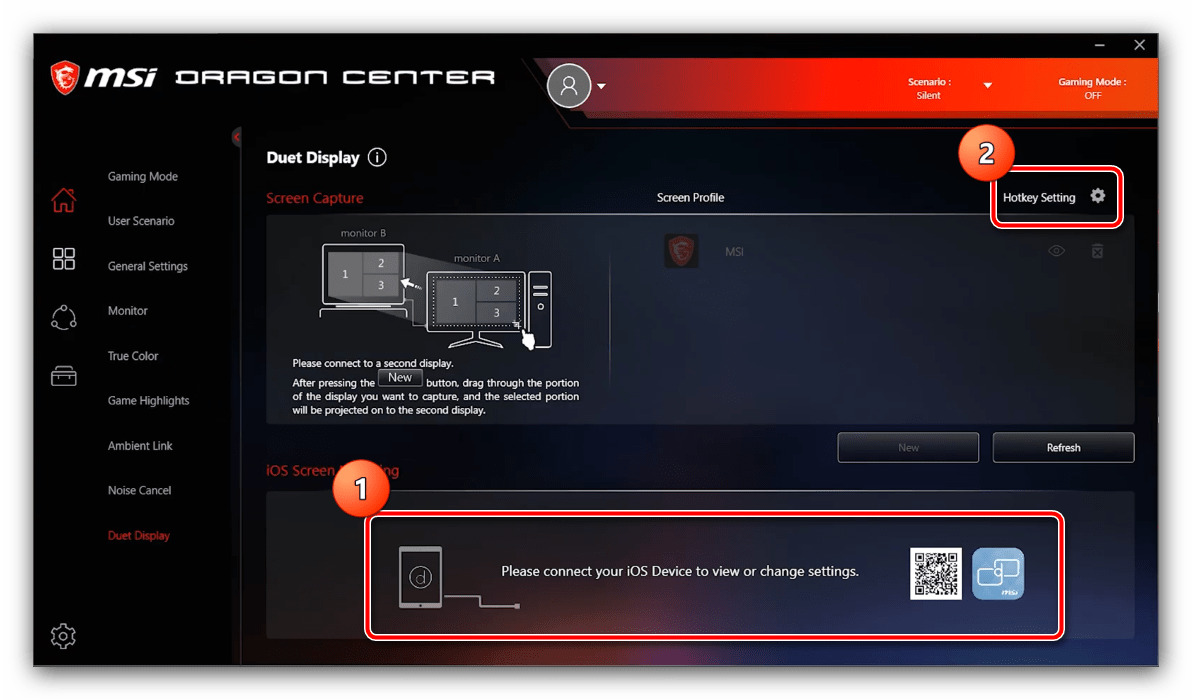 В этой вкладке можно соединить iOS-устройство и продублировать экран на него (понадобится установить приложение-компаньон), а также настроить горячие клавиши доступа — кликните по кнопке «Hotkey Settings» и задайте нужное сочетание.